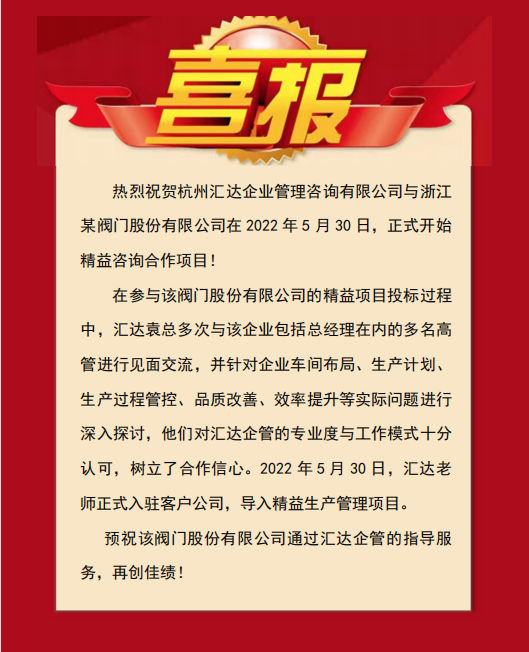 【喜報】匯達企管攜手浙江某閥門上市公司開啟精益咨詢項目